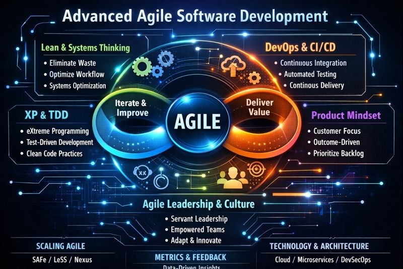 Introduction to Advanced Agile Software Development is an intensive course designed for Computer Science students at Venite University. This course delves into the intricacies of agile methodologies, focusing on advanced practices such as Scrum, Kanban, and DevOps. It equips students with the knowledge and skills needed to excel in dynamic software development environments, fostering adaptability, collaboration, and customer-centricity. Through a combination of theory, hands-on exercises, and real-world case studies, students will master advanced agile principles and gain proficiency in leading agile teams, implementing continuous integration and delivery, and driving innovation in software development processes.
