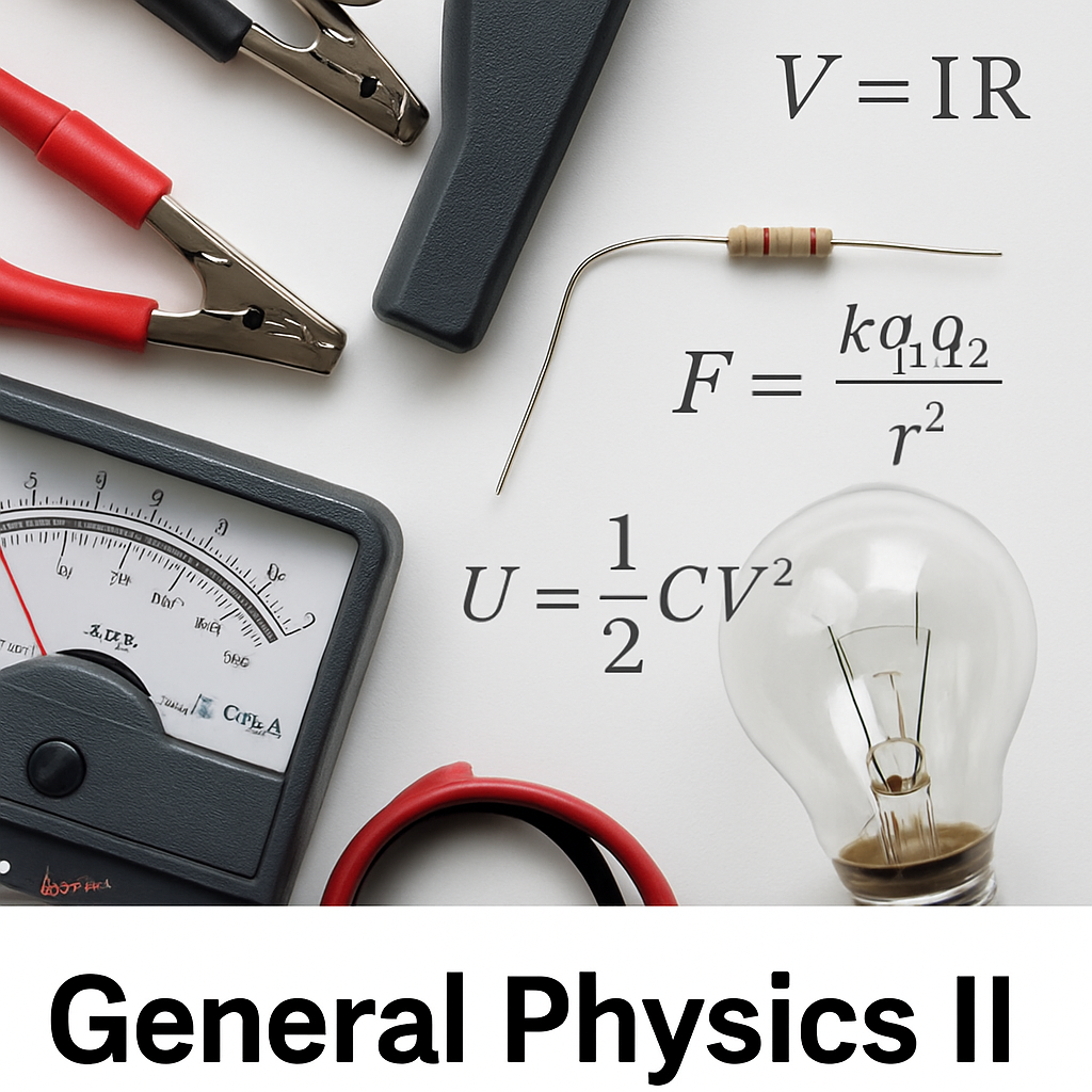 Forces in nature. Electrostatics (electric charge and its properties, methods of charging). Coulomb’s law and superposition. Electric field and potential. Gauss’s law. Capacitance. Electric dipoles. Energy in electric fields. Conductors and insulators. DC circuits (current, voltage and resistance. Ohm’s law. Resistor combinations. Analysis of DC circuits. Magnetic fields. Lorentz force. Biot-Savart and Ampère’s laws. Magnetic dipoles. Dielectrics. Energy in magnetic fields. Electromotive force. Electromagnetic induction. Self and mutual inductances. Faraday and Lenz’s laws. Step up and step down transformers. Maxwell's equations. Electromagnetic oscillations and waves. AC voltages and currents applied to inductors, capacitors, and resistance.